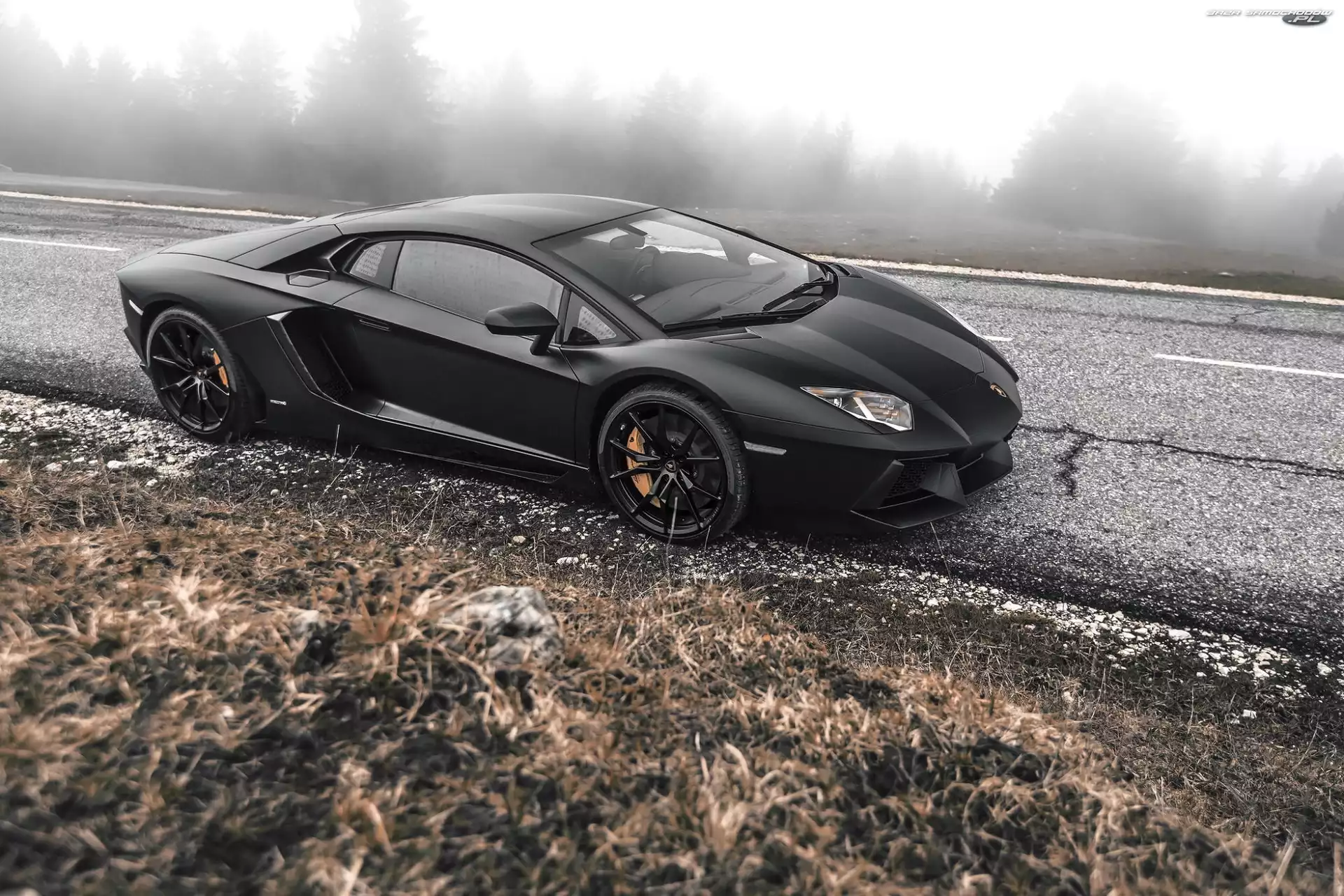 Mgła, Drzewa, Adventador, Lamborghini, Droga- Zdjęcia samochodów
